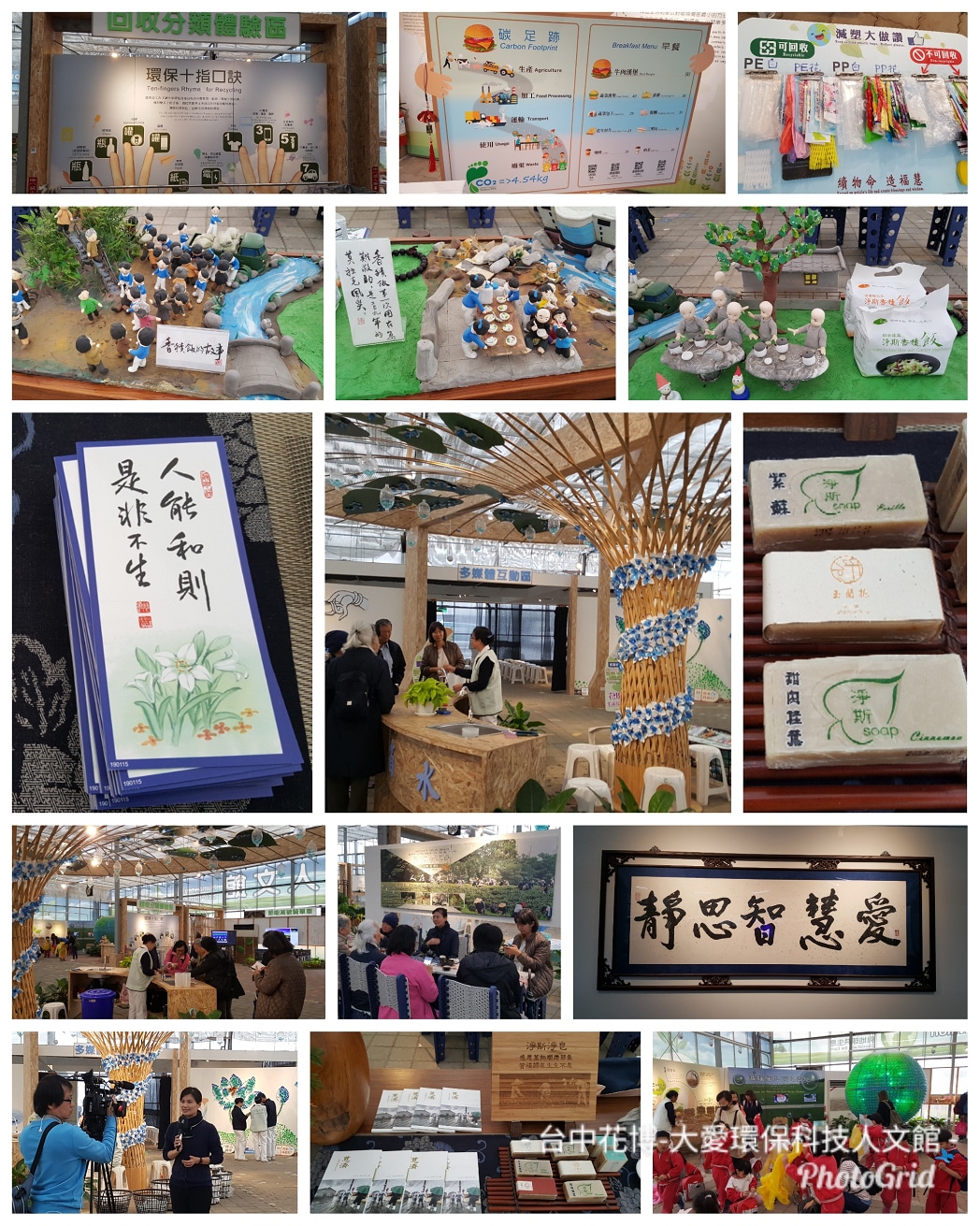 The exhibition of “Humanitarian Eco-Tech Pavilion” has been developed from scratch to seek environmental protection and carbon reduction. The wires of the 300-square-meter exhibition hall are selected and reused from the Bathing Buddha Festival, and the steel frame structure is outsourced with environmentally friendly recycled wood chip compression boards with the interlocking bricks on the ground laid by volunteers. The space design is divided into an exhibition area, an interactive area and an implementation area. It mainly displays the research and development achievements of Da-Ai Grateful Technology Co., Ltd. and the efforts of Tzu-Chi volunteers around the world dedicated to environmental protection for many years.